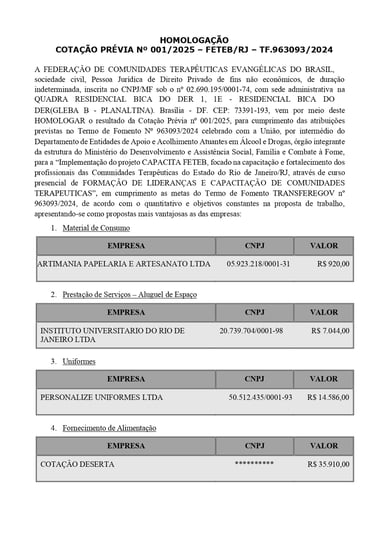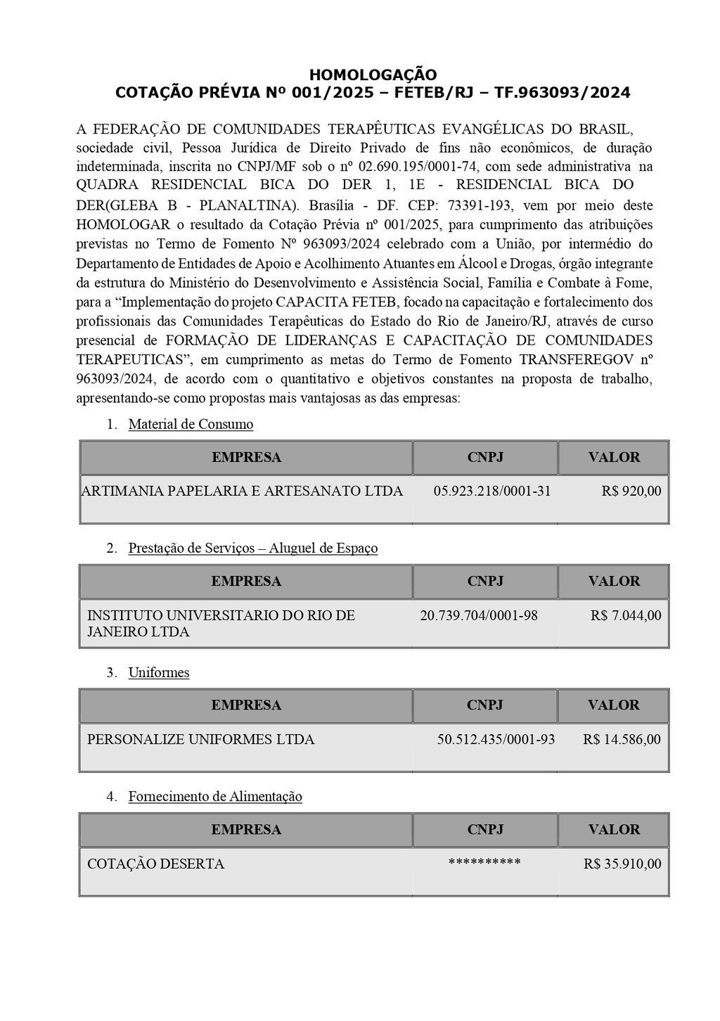 Homologação Edital 001/2025 RJ - Bens e Prestação de Serviços